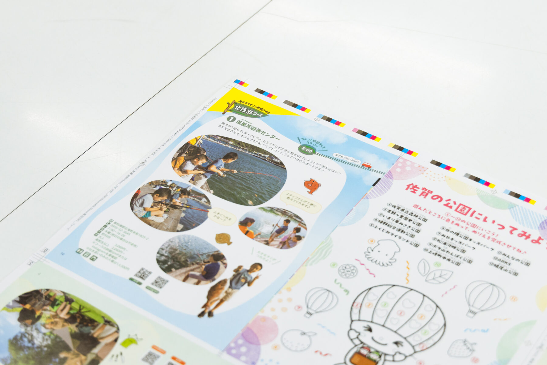 冊子の中にある塗り絵のページも最初から入れたかったページでした。公園というのは無料で遊べる場所なので、冊子の中にもお子さんが無料で遊べるスペースを作りたかったんです。県の担当者の方から、佐賀らしさを入れてはどうかとアドバイスをいただき、イカとかバルーンとか、そういう絵柄も入れました。